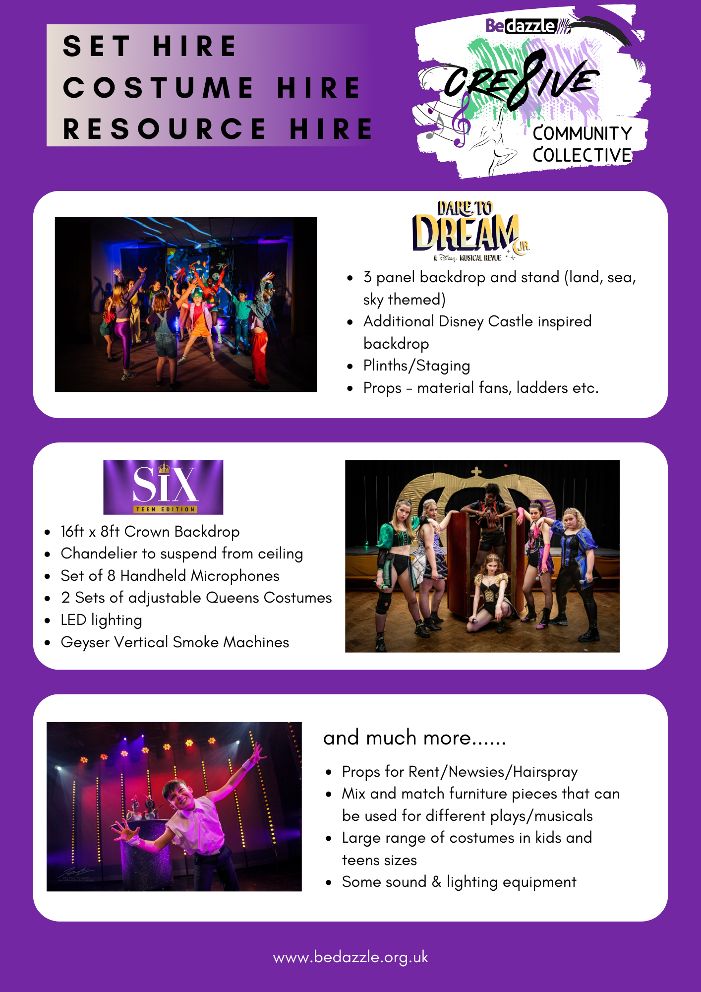 Down in the depths of our basement is our very own Aladdin’s Cave of costumes, set pieces, props and other event resources. These are all available to hire by like minded schools and community groups.